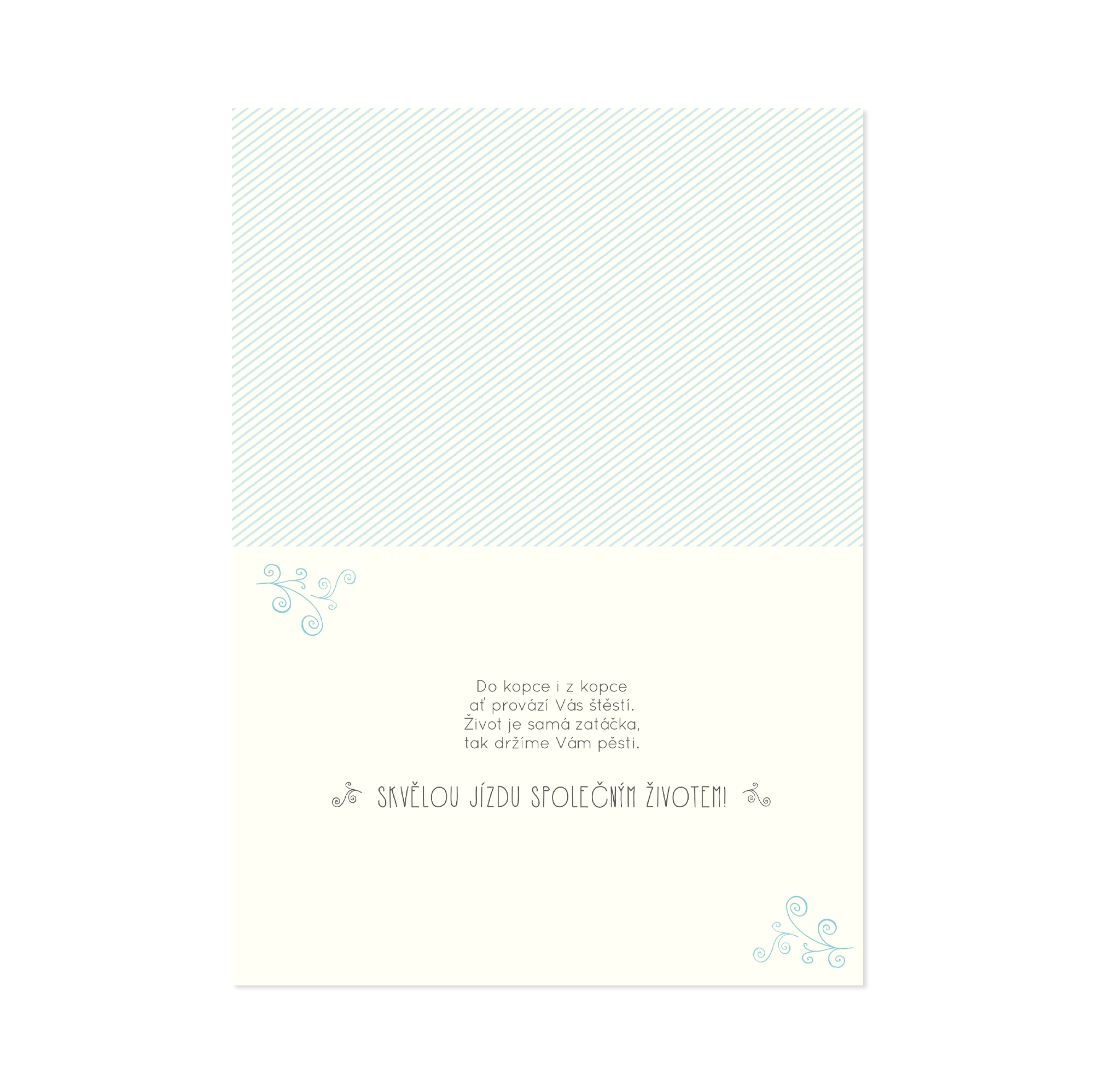 Žádný svatební dar se neobejde bez svatebního přání. Svatební přání si můžete napsat sami, nebo využít již předepsané texty. Uvnitř přáníčka je text: Do kopce i z kopce ať provází Vás štěstí. Život je samá zatáčka, tak držíme Vám pěsti. Skvělou jízdu společným životem!