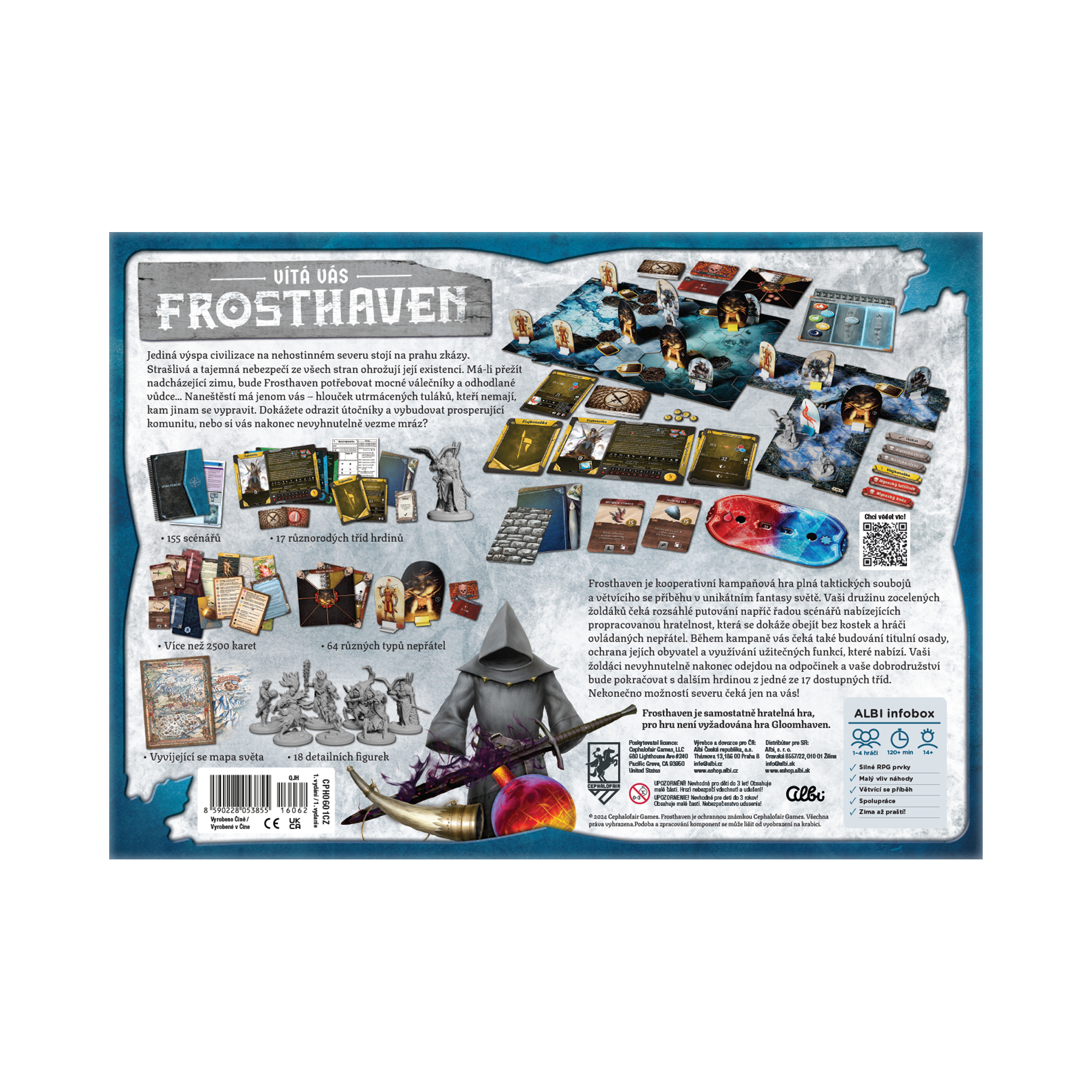 Frosthaven je kooperativní fantasy hra, která vychází z prostřední a herních principů Gloomhavenu – nejlépe hodnocené deskové hry světa (podle uživatelů serveru Boardgamegeek). Ještě větší a epičtější pokračování vypráví příběh malé osady Frosthaven daleko na severu, tisíce mil vzdálené od hlavního města, Velkého dubu. Frosthaven je stolní hra na hrdiny s příběhem ohromujícího rozsahu a nebývalým množstvím komponent, která hráče zabaví na stovky hodin. Ve hře se ujmete jednoho ze 17 hratelných hrdinů, z nichž každý přináší unikátní herní styl a pokusíte se svými spoluhráči uspět ve větvící se příběhové kampani, točící se okolo nejsevernější výspy civilizace. Více informací o vybraných hrdinech se dozvíte zde. Kromě soubojů s nestvůrami budete řešit hádanky, shánět suroviny, vytvářet z nich předměty a také budete rozvíjet samotnou osadu Frosthaven. Střídání zimy a léta je rovněž novým prvkem, s nímž bude potřeba ve hře počítat. Vychutnejte si ohromující množství obsahu, větvící se příběh a oceňované herní mechanismy v této epické strategické hře pro hráče od 14 let. Takže je to jen ještě větší Gloomhaven? Ano i ne. Frosthaven reaguje na řadu výtek, které hráči vůči Gloomhavenu měli – přináší tak výrazně variabilnější scénáře, ještě více činností, které lze řešit mezi scénáři (budování osady, vytváření předmětů), další výrazná vylepšení nad rámec obří nové kampaně a 17 nových hrdinů. Více informací o rozdílu mezi hrou Gloomhaven a Frosthaven ve článku zde. Je ke hraní potřeba Gloomhaven? Není, Frosthaven je samostatně hratelná hra. Hra Frosthaven obsahuje: 4 knihy se 138 scénáři, 17 hratelných hrdinů se svými komponentami – kartami, figurkami, bloky, žetony… více jak 2500 karet, 64 typů nepřátel, desítky dalších komponent, pravidla v českém jazyce.