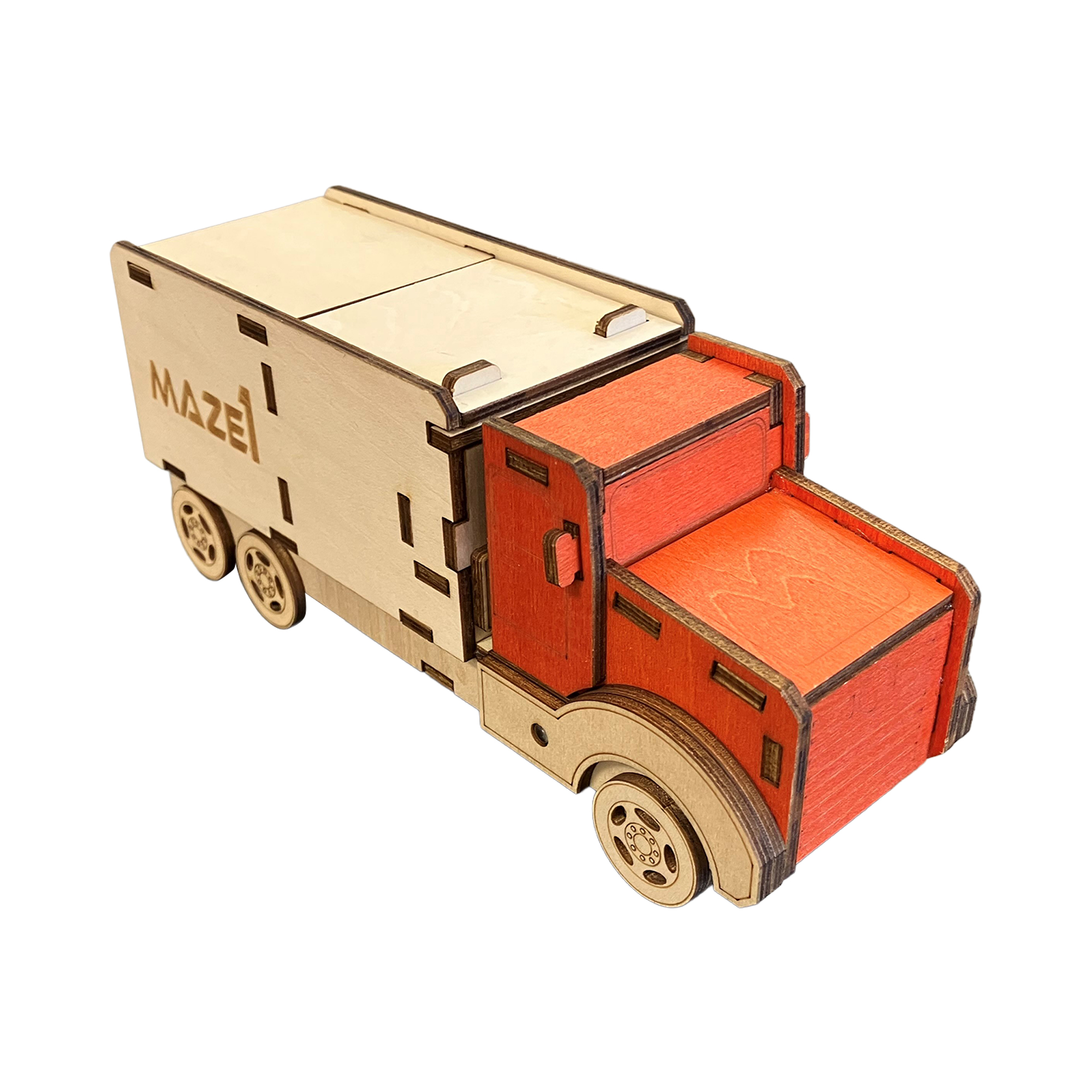 Hledáte originální způsob, jak darovat peníze, šperk nebo drobné cennosti? Hlavolamový box není jen krásný dřevěný model nákladního auta, ale především důmyslný 3D hlavolam se skrytou přihrádkou. Tento hlavolam je vhodnou zábavou pro experty i jako stylový interiérový doplněk. Díky kvalitnímu dřevěnému provedení poslouží jako perfektní „schovka“ na vaše poklady, ke kterým se dostane jen ten, kdo odhalí tajemství mechanismu. Materiál: dřevo Rozměry: 12,5 × 23,7 × 8,7 cm