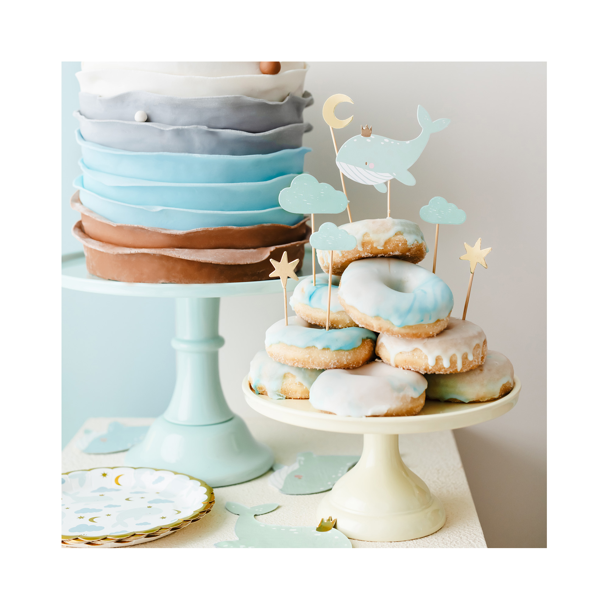 Jsme rádi, že jste našli naši krásnou sadu zápichů ve tvaru velryby s korunkou, hvězdami, měsíci a mraky laděnou do modré barvy. Tímto roztomilým setem zápichů můžete ozdobit dort či cupcake při uvítací oslavě k narození chlapečka. Pro další párty doplňky či dekorace v motivu přivítání díčka.
